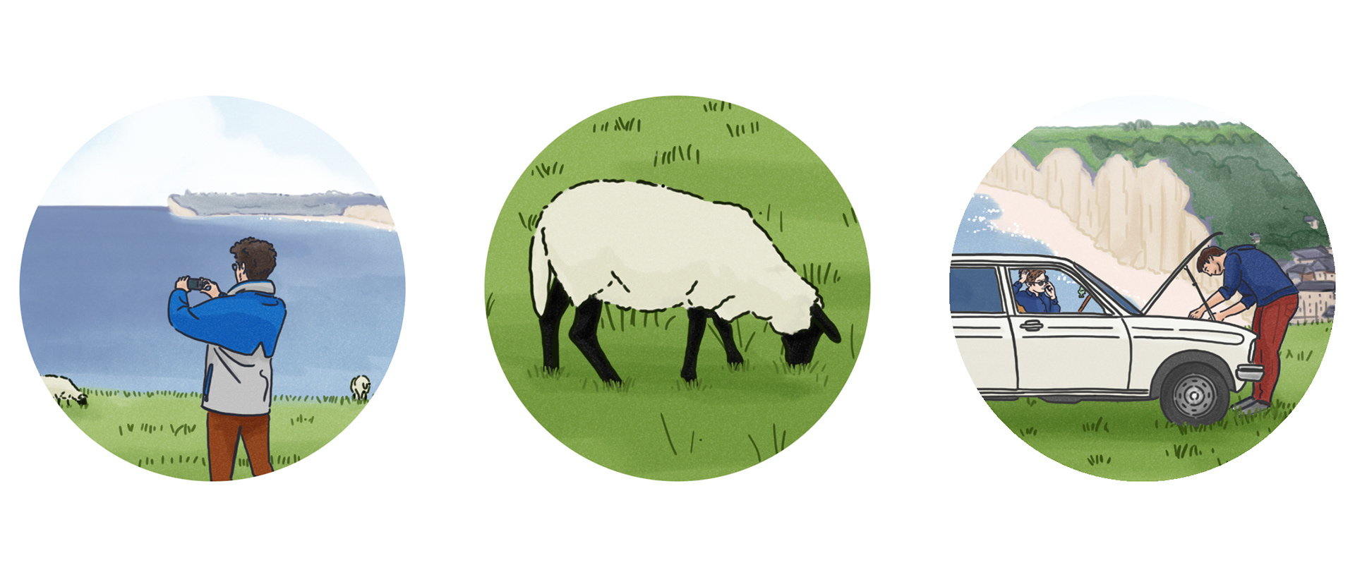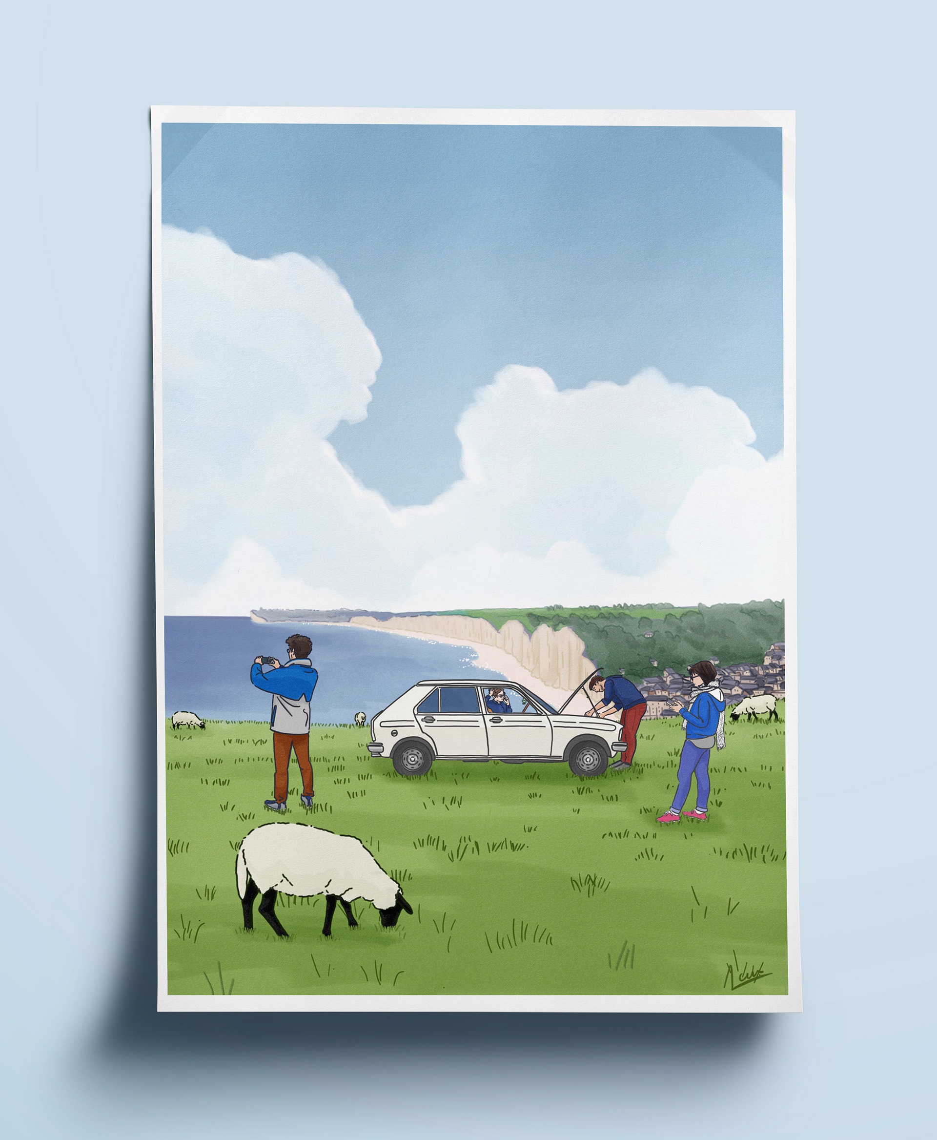 This is a poster named the "broken down car" trick, it was inspired by a lovely weekend retreat with friends on the north-west french coast. Thanks to a fortunate breakdown of the retro Peugot 104 (a little french car made during the seventies) we were able to enjoy the white cliffs landscape of this part of France (called alabaster coast) a little bit longer. We even have the luxury to share a tasteful lunch on the seaside, while waiting for the mechanic to come.