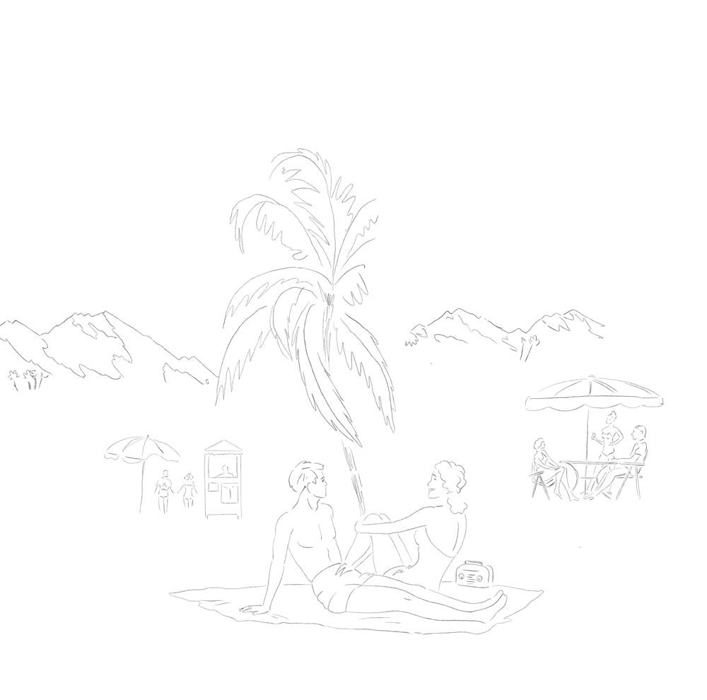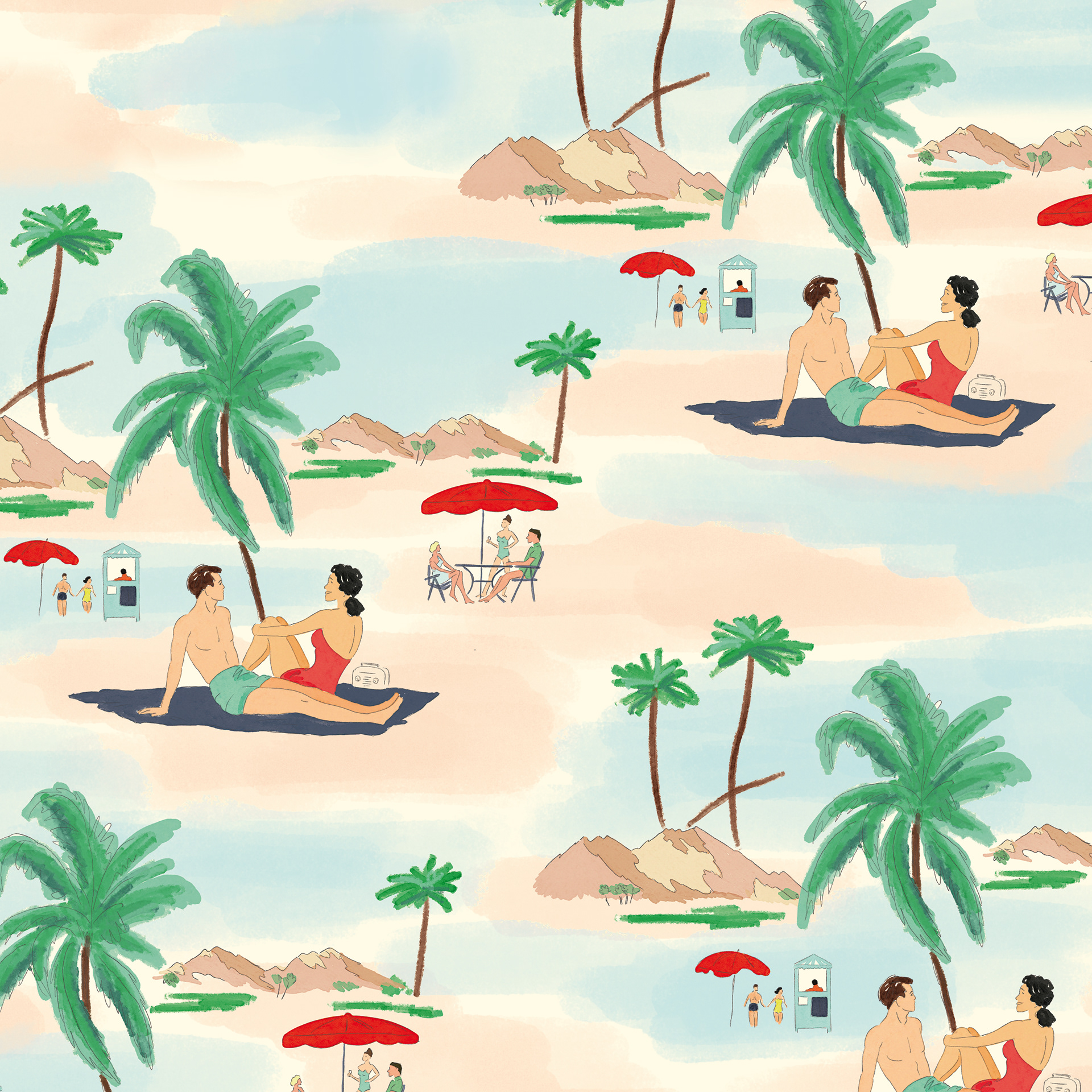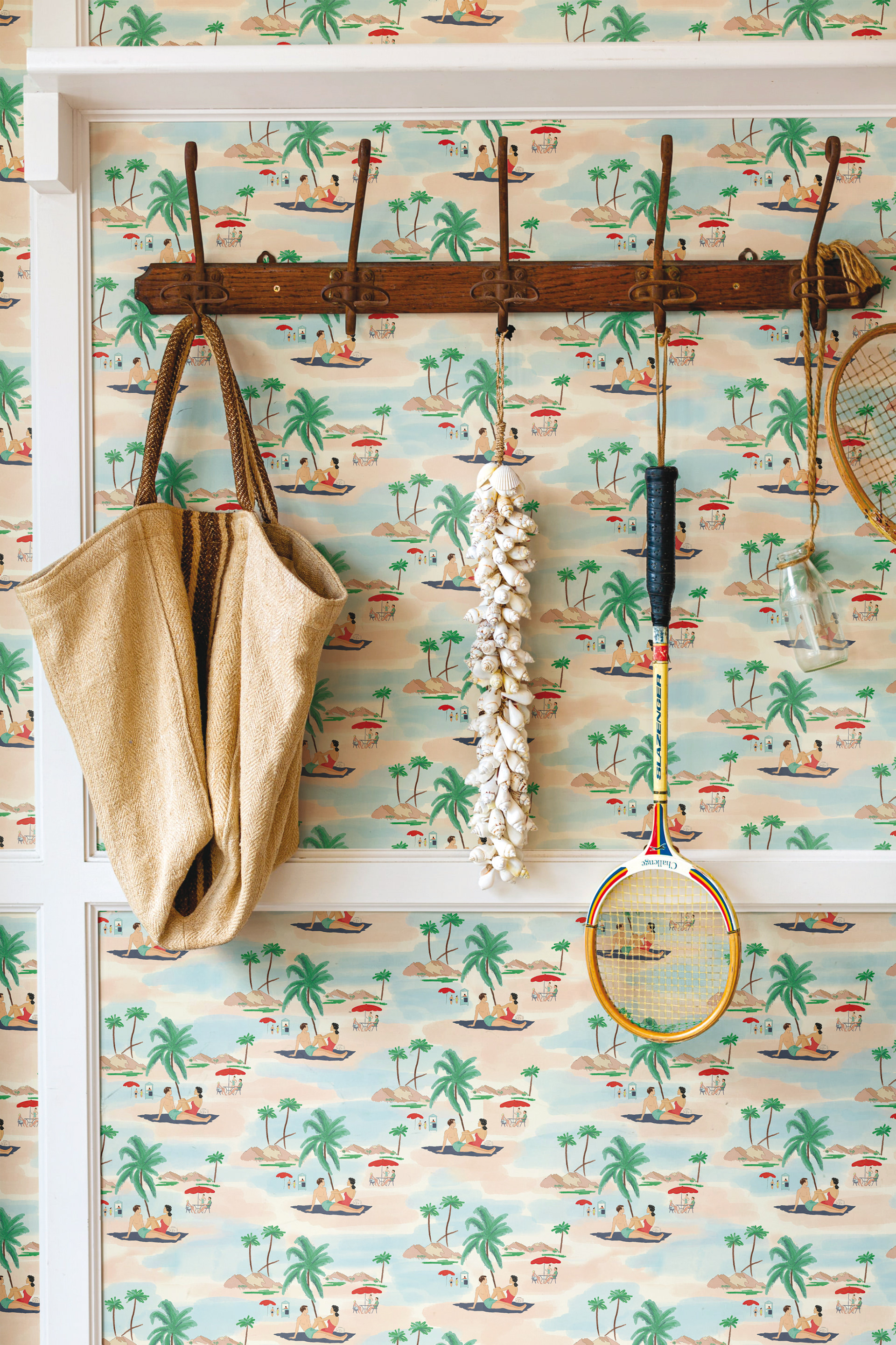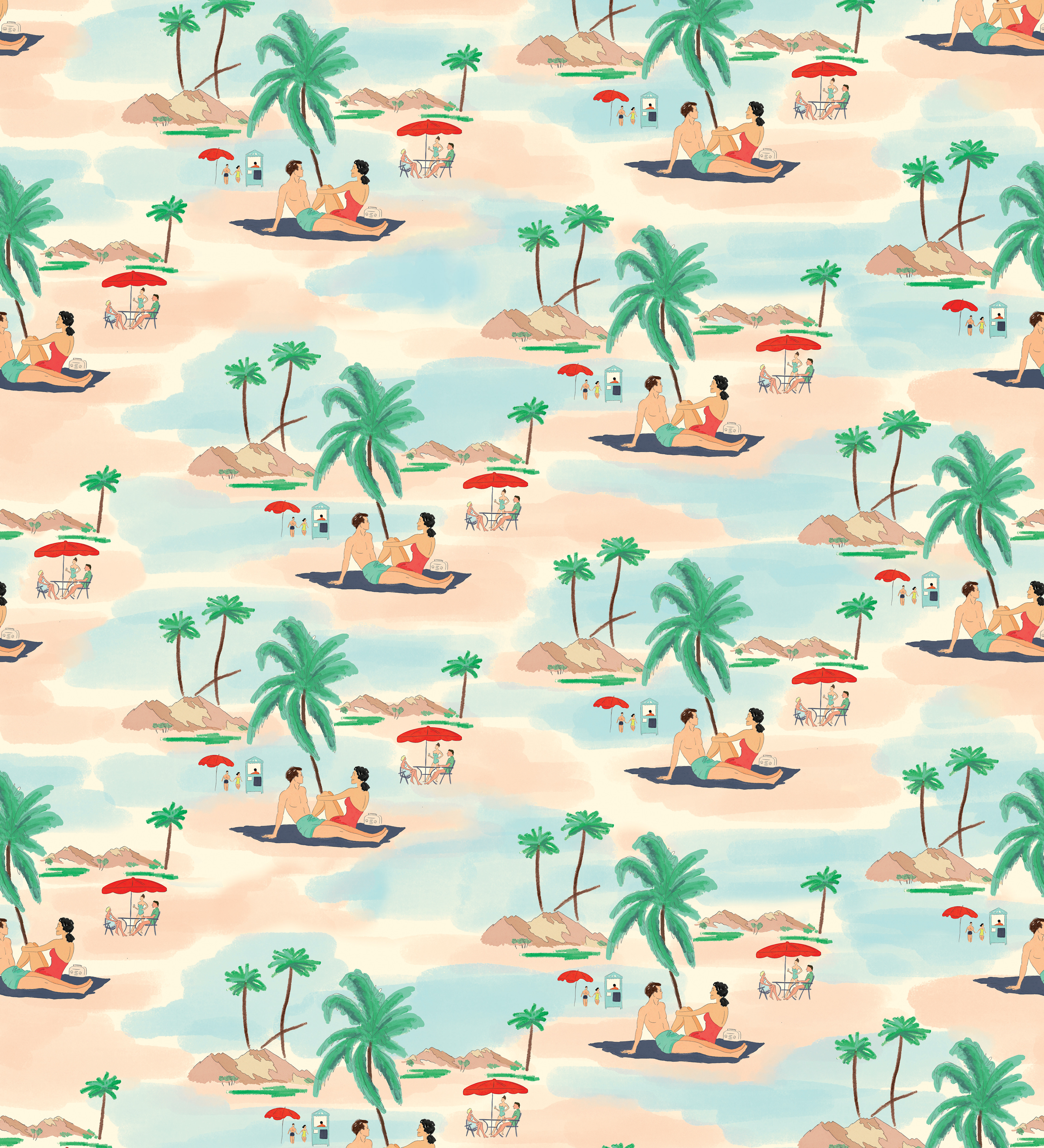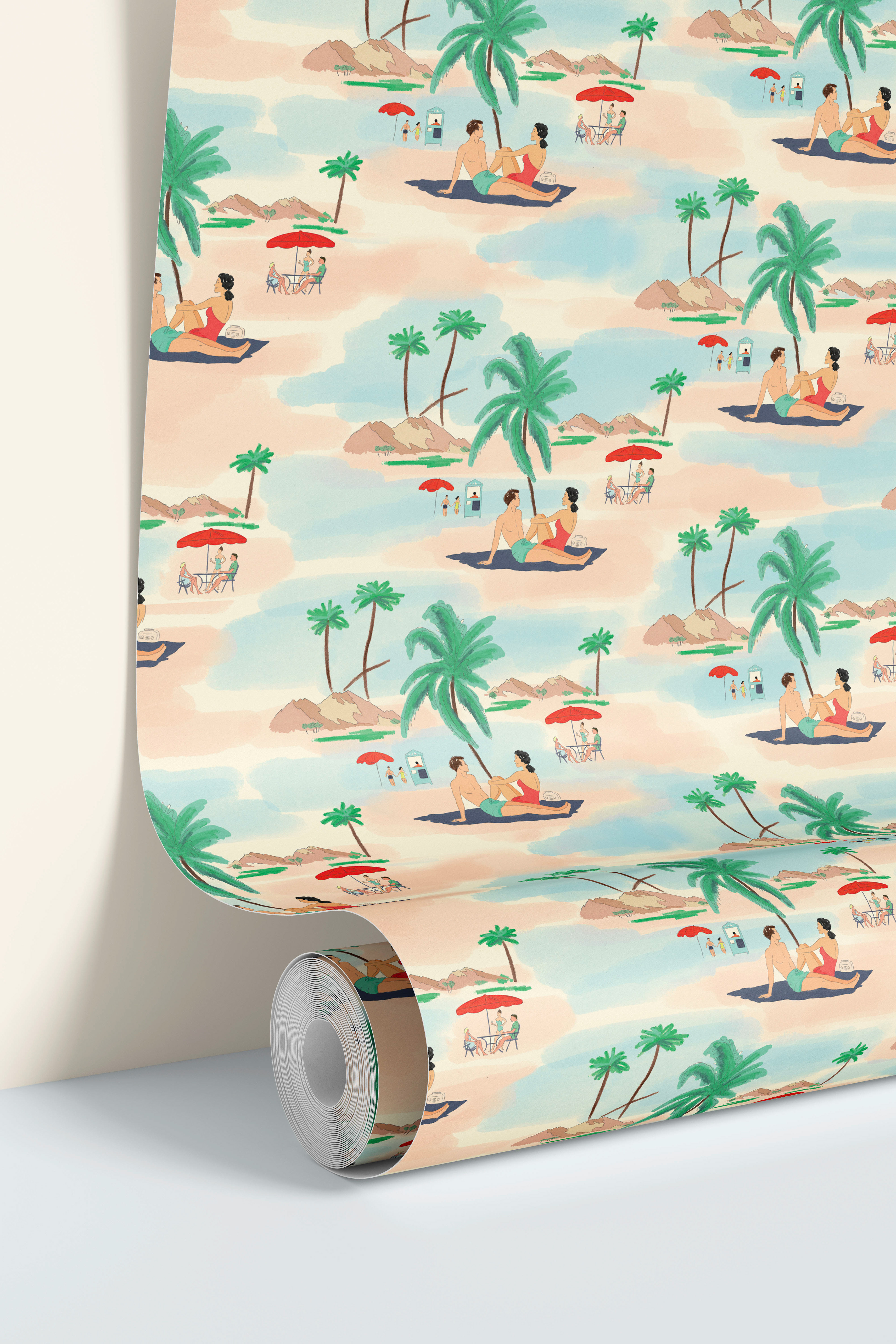 Step into a nostalgic world of sun-kissed shores and vibrant colors with this exclusive print. Originally crafted for a high-end clothing brand, it has now found its perfect home with the french wallpaper brand Mues Design.